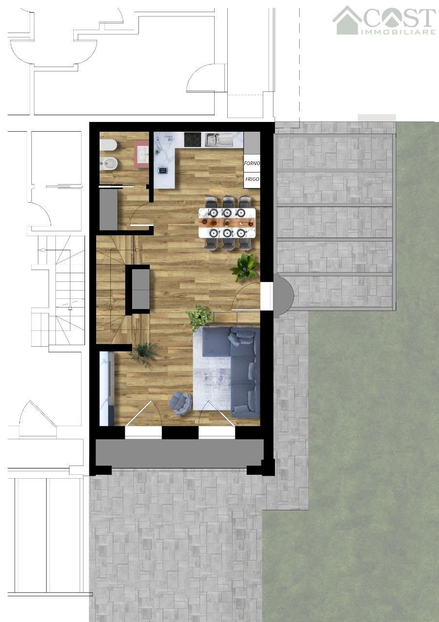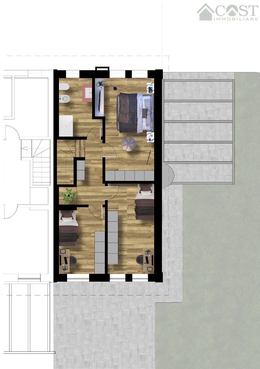 L'unità D è un'abitazione sviluppata al piano terra, primo e secondo con accesso pedonale e carraio indipendenti direttamente dal giardino privato di quasi 350mq! La metratura della parte abitativa supera i 160mq e prevede i seguenti ambienti: al piano terra un accogliente ingresso con comodo guardaroba, bagno e lavanderia ricavata nel sottoscala oltre al garage con collegamento interno, portico sfruttabile come secondo posto auto e pompeiana; al piano primo la zona giorno open space con soggiorno e cucina a vista sfiora i 42mq calpestabili ed offre oltre ad un secondo bagno, una terrazza a loggia; il secondo ed ultimo piano è adibito alla zona notte con tre spaziose camere smistate da un disimpegno attrezzabile ed un terzo ed ultimo bagno. Vengono abbinati in oltre due posti auto esterni privati!