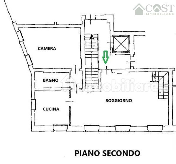 L'ascensore porta direttamente al piano secondo e l'immobile si compone di ingresso su soggiorno/pranzo con bellissimi affacci e splendida luminosità, cucina separata, primo bagno completo di doccia e camera matrimoniale.